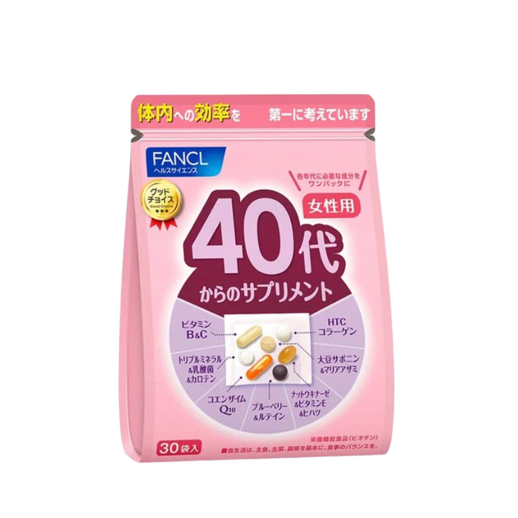 Fancl merupakan multivitamin yang memngandung 7 macam vitamin diantaranya Vitamin B&C, Lactobacillus, DHA, Kalsium&Zinc, Iron, HTC Kolagen, Q10, Vitamin E, dan Blueberry.